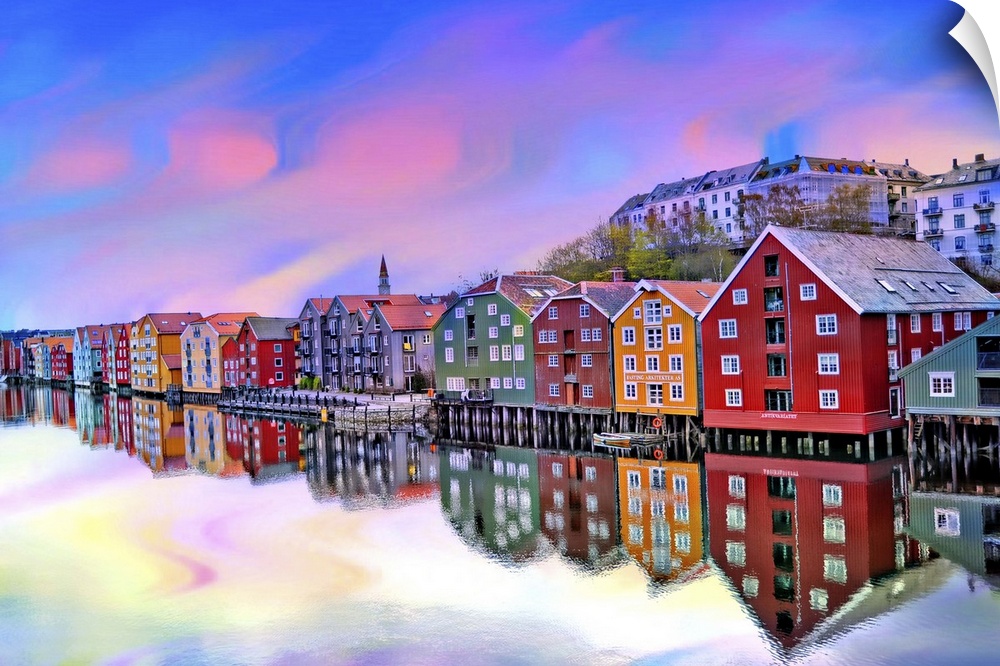 <p>Colorful buildings along the river Nid, reflecting beautiful pastel shades, Norway.</p>