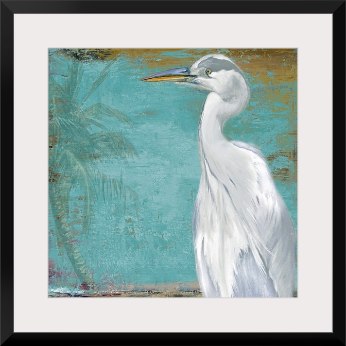 <p>Docor perfect for the home of a painted white heron peering to the left where there is a faded palm tree.</p>
