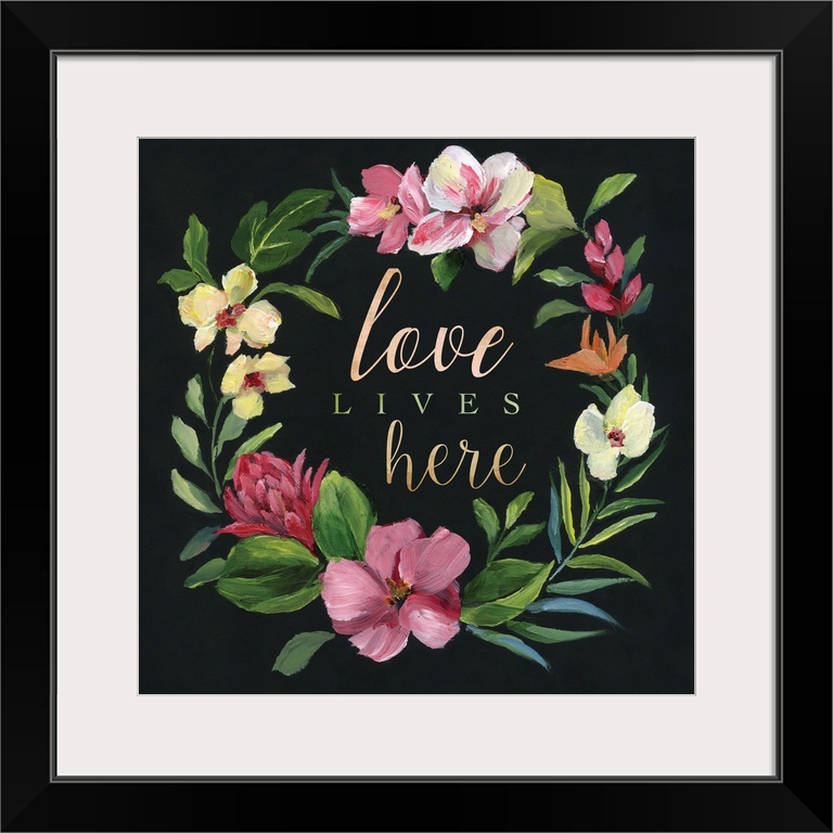 <p>The words, "Love lives here" are surrounded by a wreath of painted green foliage with flowers against an almost black background.</p>