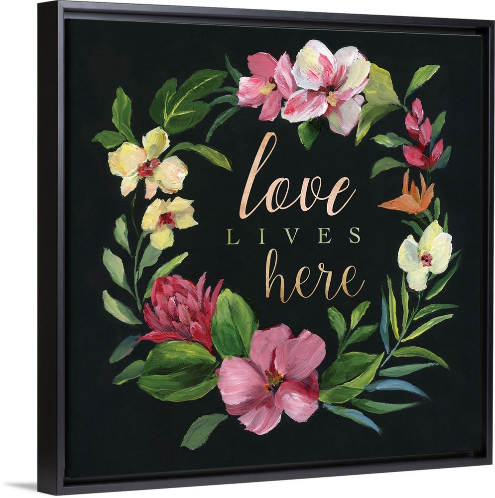 <p>The words, "Love lives here" are surrounded by a wreath of painted green foliage with flowers against an almost black background.</p>