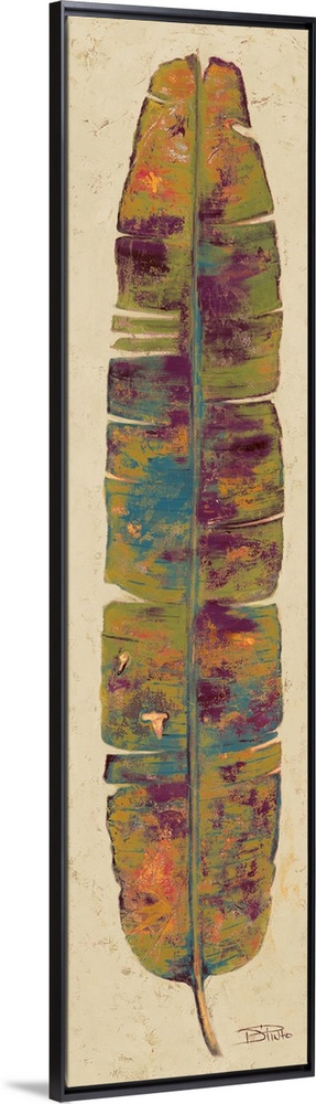<p>Contemporary painting of a multi-colored tropical leaf.</p>