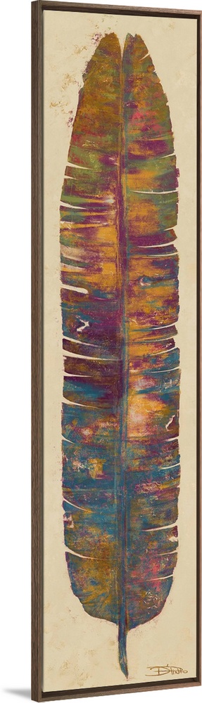 <p>Contemporary painting of a multi-colored tropical leaf.</p>