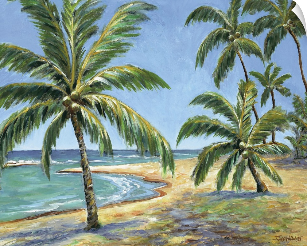 <p>Contemporary painting of large palm trees on a tropical beach.</p>
