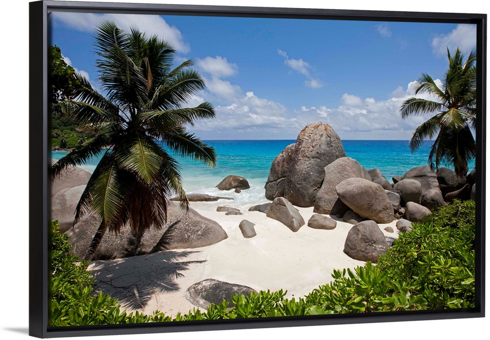 <p>Seychelles, Mahe Island, Palm tree and remote tropical beach along Indian Ocean north of town of Victoria</p>