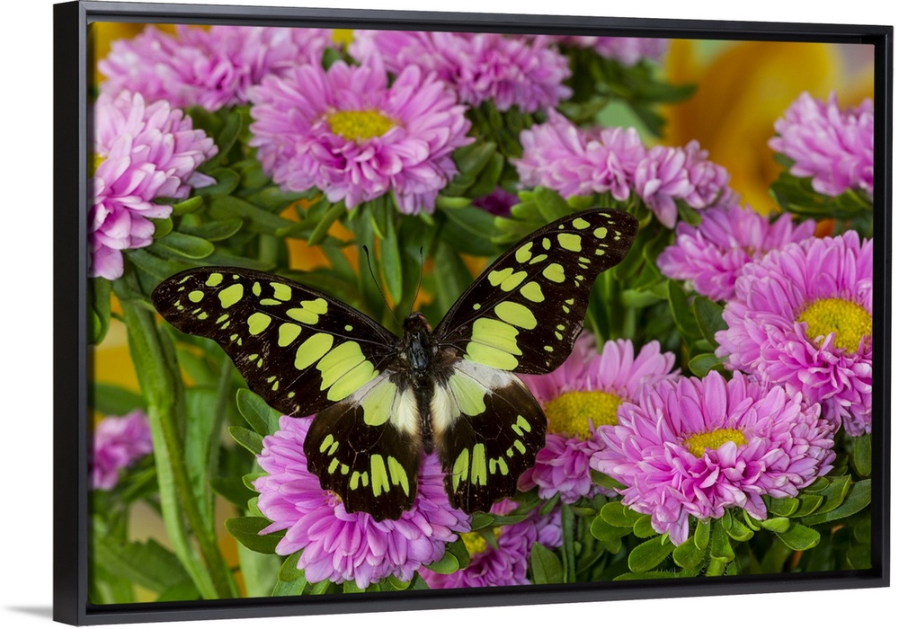 <p>Tropical butterfly, Graphium tynderacus, on pink mums</p>