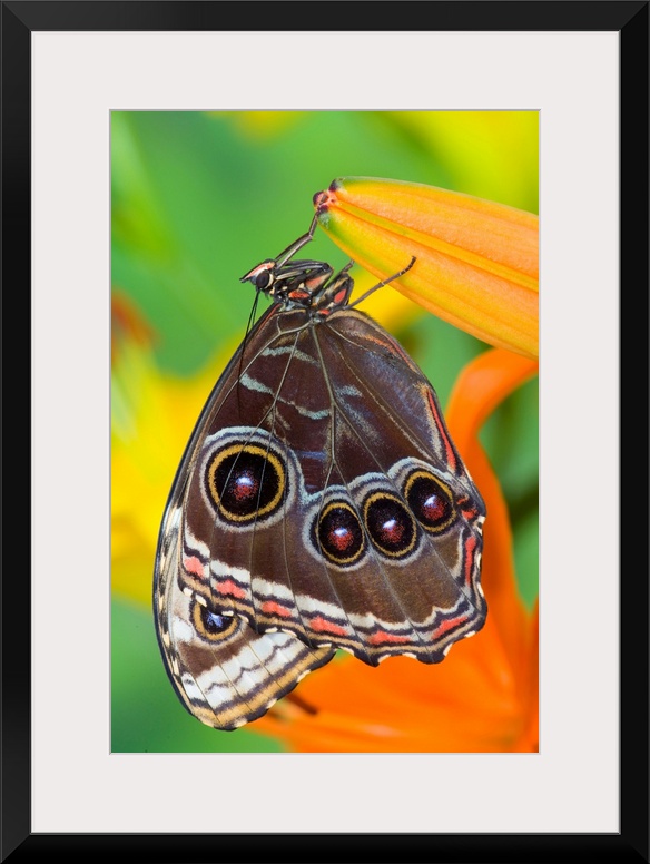 <p>Tropical Butterfly the Blue Morpho, Morpho granadensis with wings closed on lily.</p>