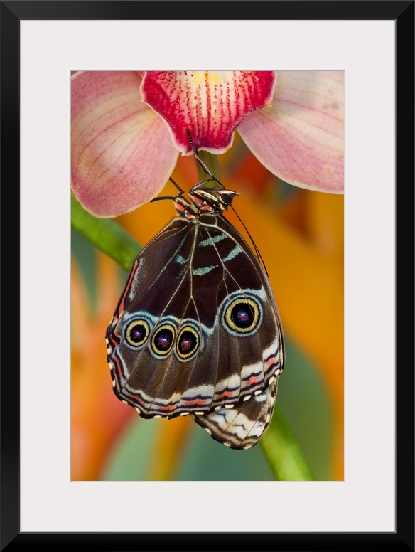 <p>Tropical Butterfly the Blue Morpho, Morpho peleides wings closed hanging on Orchid.</p>