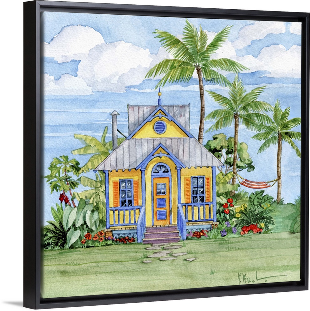 <p>Watercolor painting of a colorful beach cottage, with tropical plants and palm trees.</p>