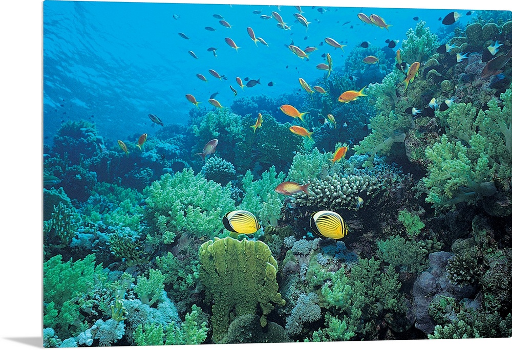 <p>Photograph of underwater sea life with brightly colored fish swimming over coral.</p>