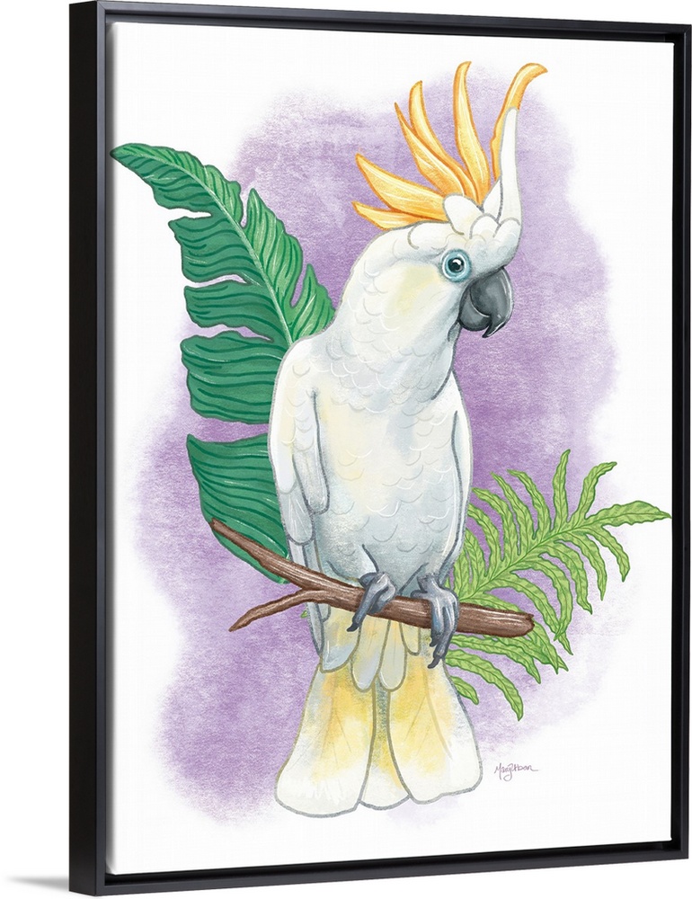 <p>Vertical illustration of a colorful cockatoo perched on a branch with a purple background.</p>