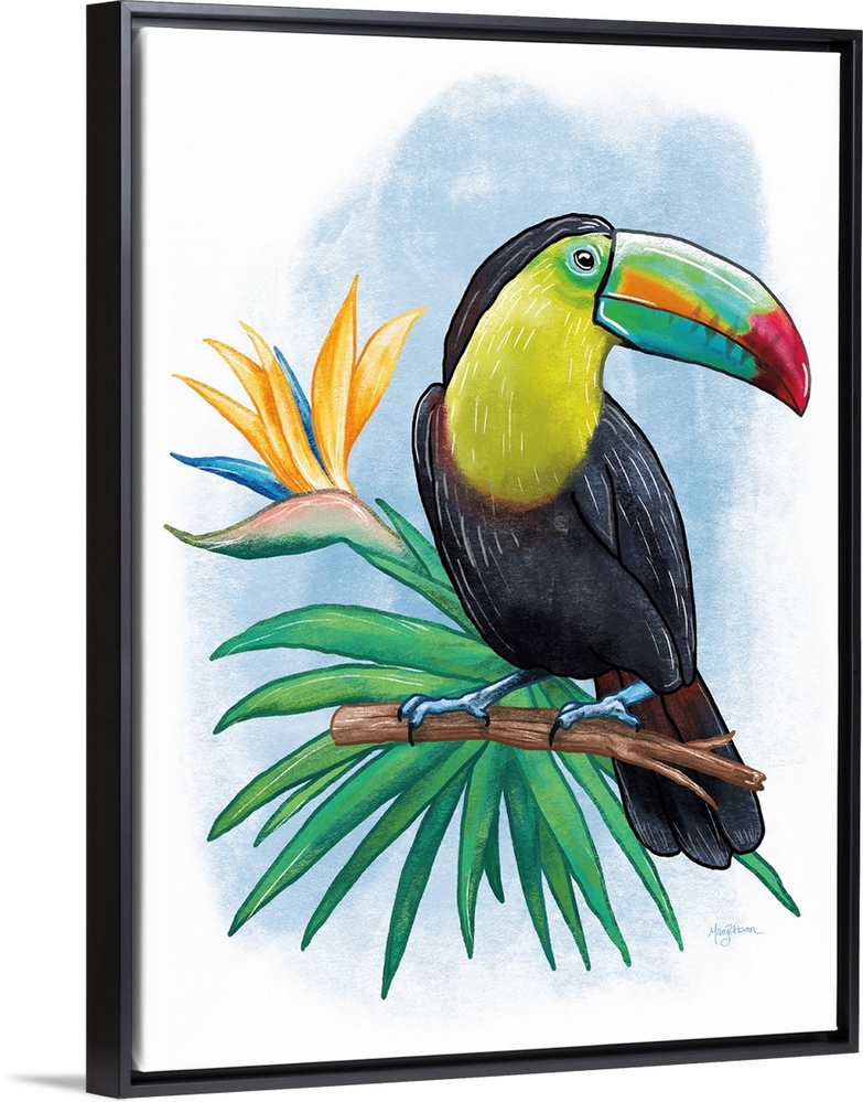 <p>Vertical illustration of a colorful toucan perched on a branch with a blue background.</p>