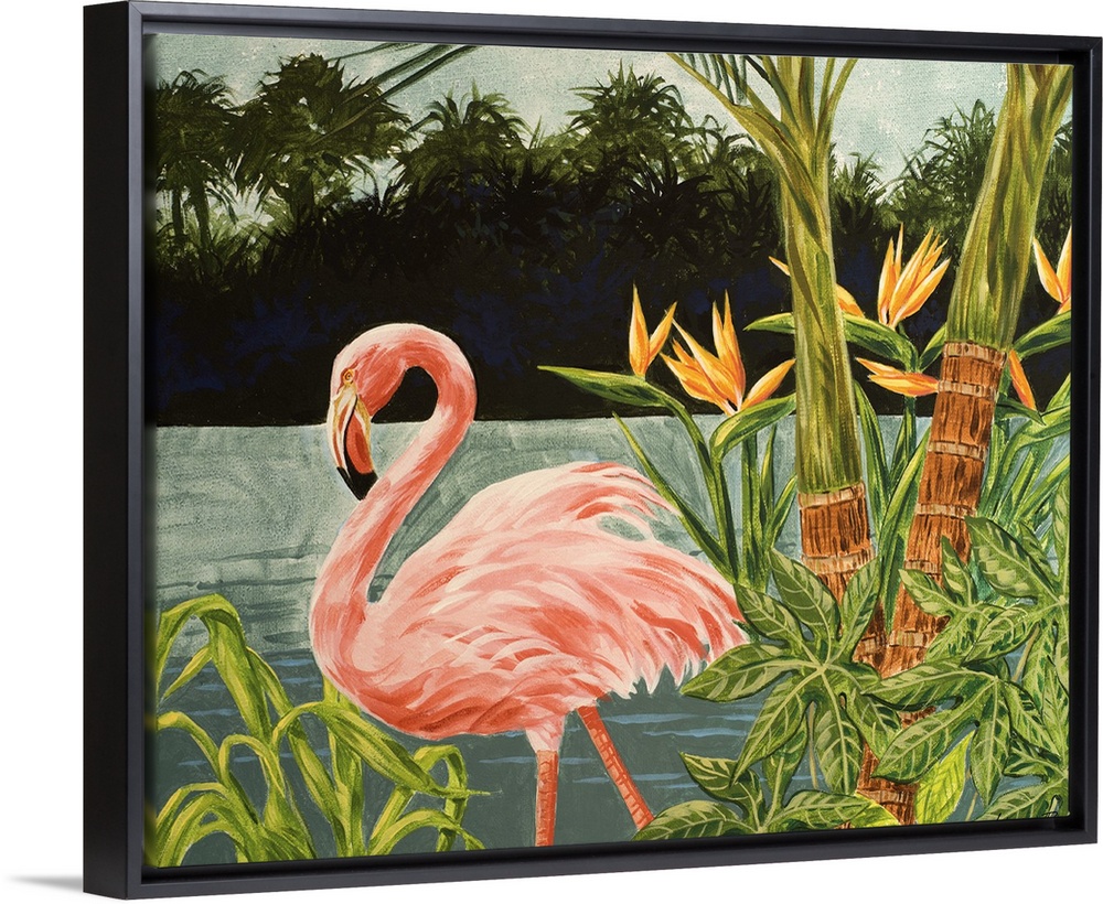 <p>Contemporary artwork of a flamingo among tropical plants.</p>