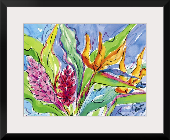 <p>Contemporary painting of bird of paradise flowers, with other tropical flowers.</p>
