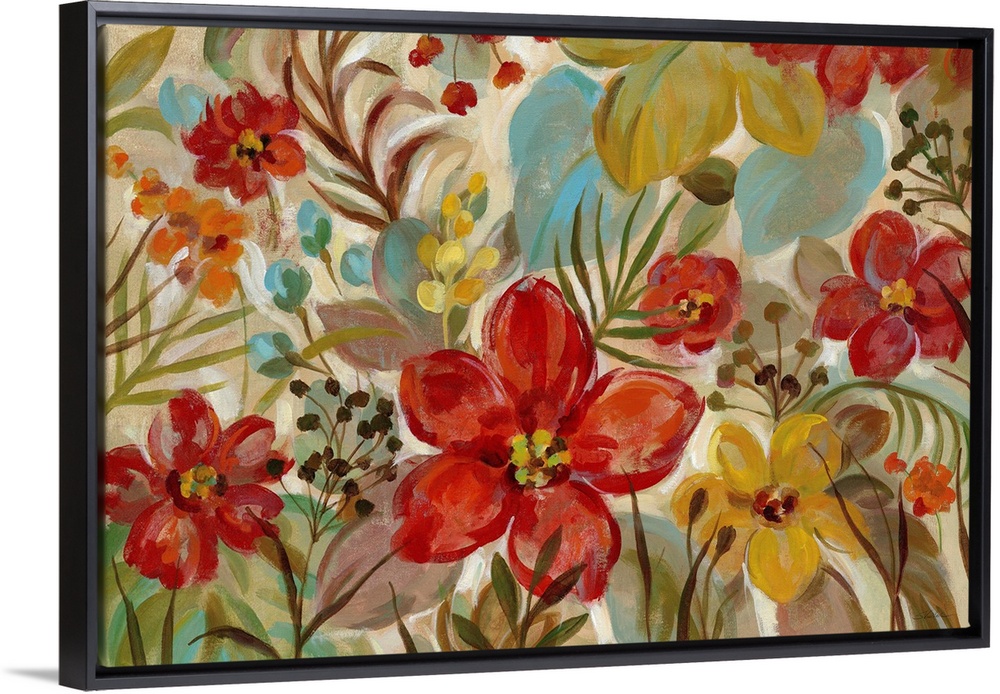<p>Contemporary painting of tropical flowers on a beige background.</p>