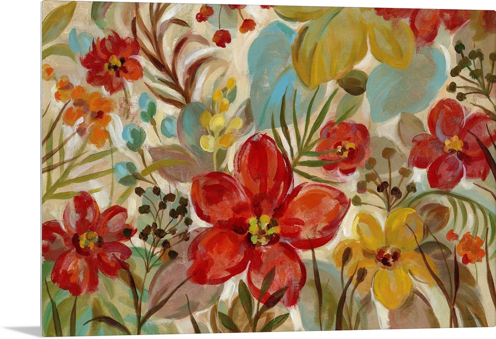 <p>Contemporary painting of tropical flowers on a beige background.</p>