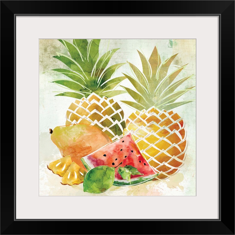 <p>Square decor with illustrations of tropical fruit such as pineapple, watermelon, and mango.</p>