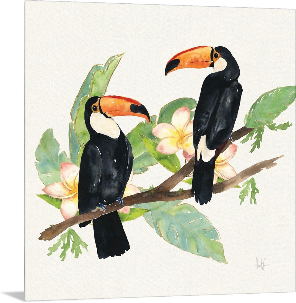 <p>Square watercolor painting of two toucans on a branch with green tropical leaves and pink orchids.</p>