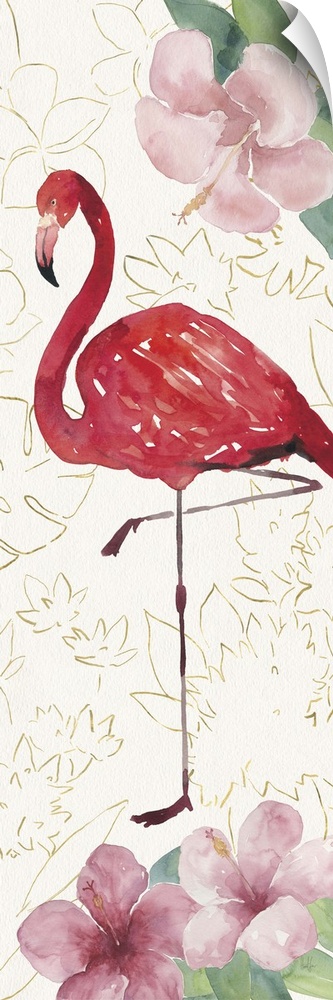 <p>Tall rectangular watercolor painting of a pink flamingo with hibiscuses on a textured white background with metallic gold outlines of tropical flowers and leaves.</p>