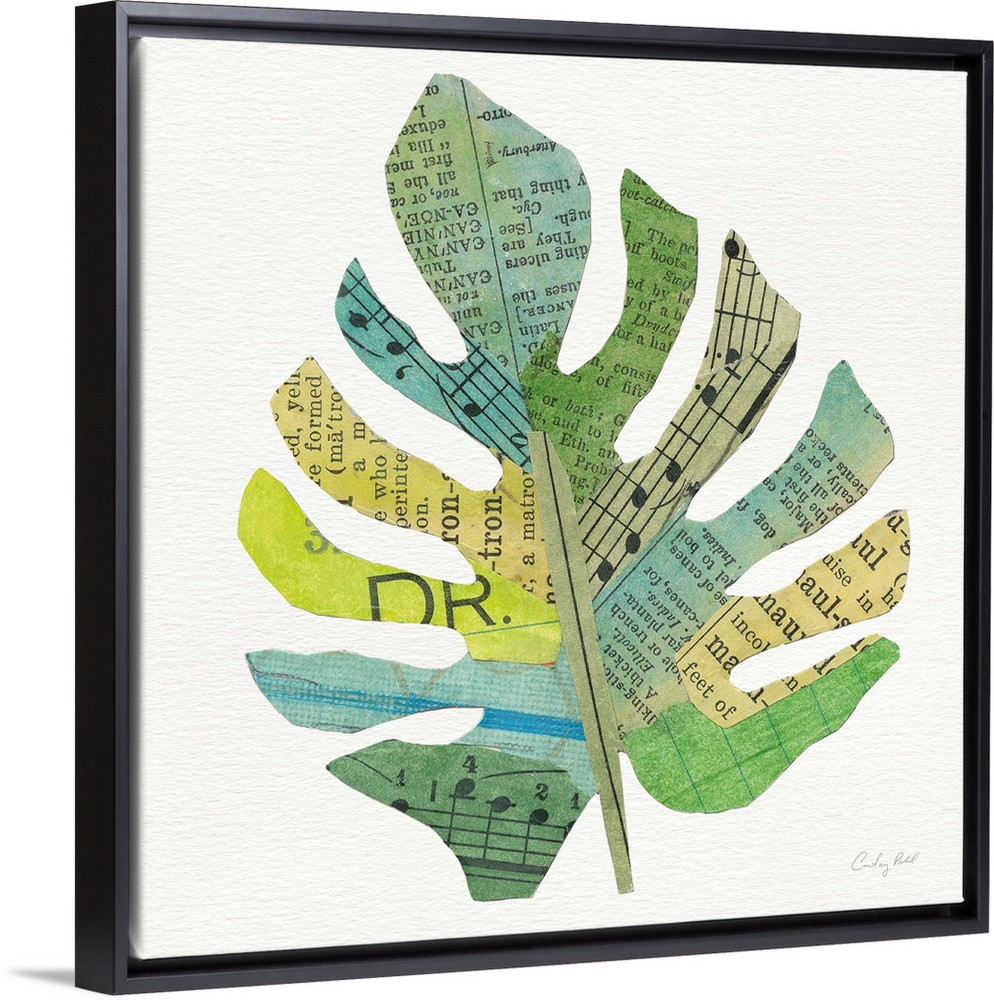 <p>Square decor with a green, blue, and yellow toned palm leaf made out with mixed media.</p>