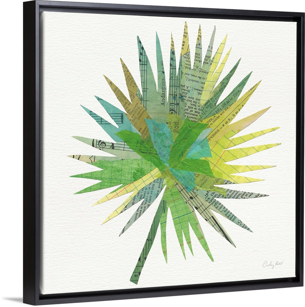 <p>Square decor with a green, blue, and yellow toned palm leaf made out with mixed media.</p>