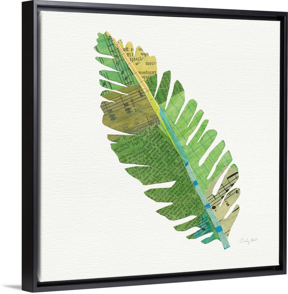 <p>Square decor with a green, blue, and yellow toned palm leaf made out with mixed media.</p>