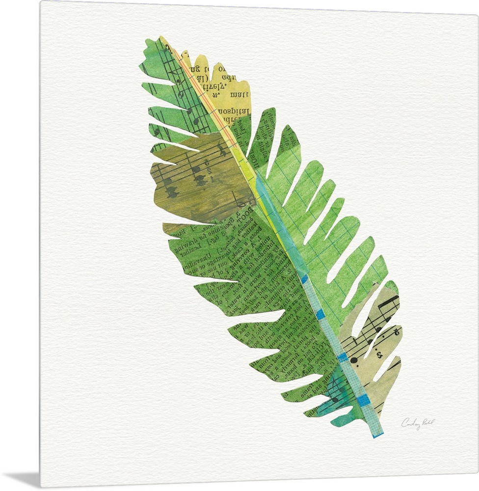 <p>Square decor with a green, blue, and yellow toned palm leaf made out with mixed media.</p>