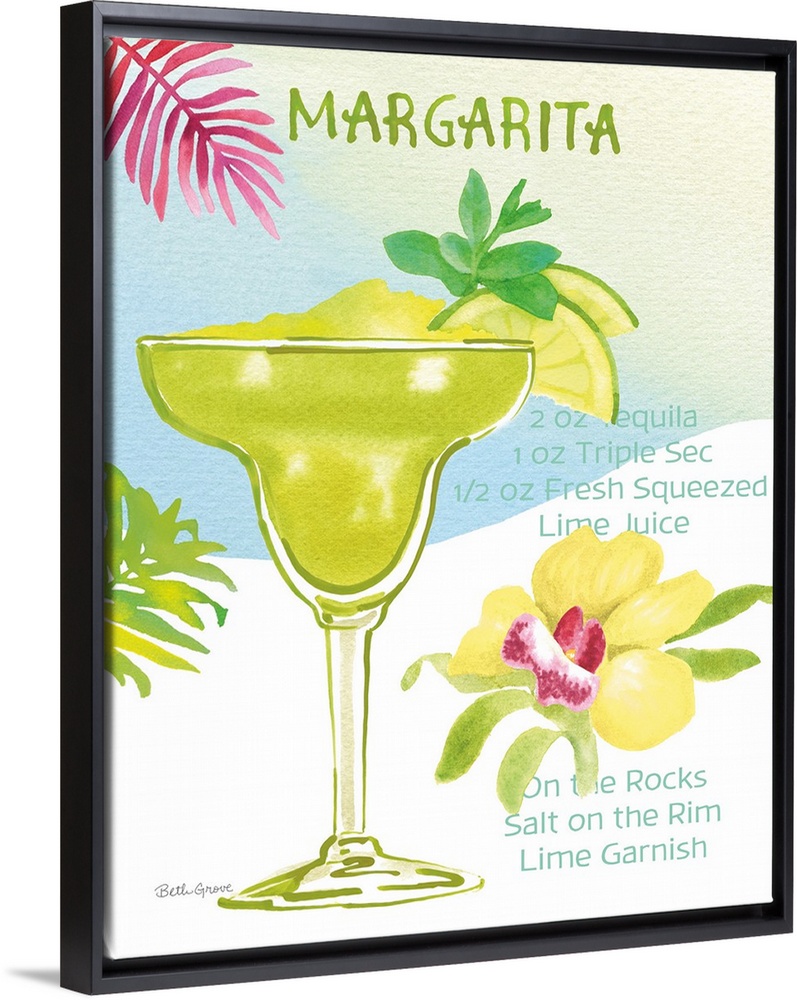 <p>Decorative artwork of a Margarita cocktail with tropical decorations and the ingredients written on the side.</p>