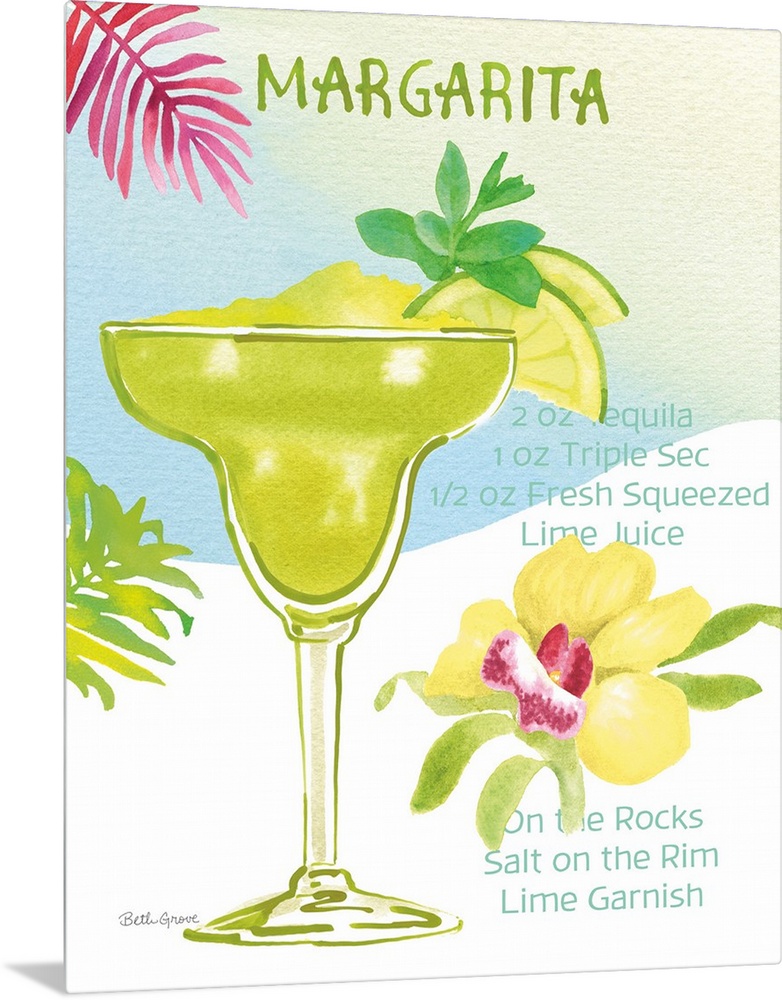 <p>Decorative artwork of a Margarita cocktail with tropical decorations and the ingredients written on the side.</p>