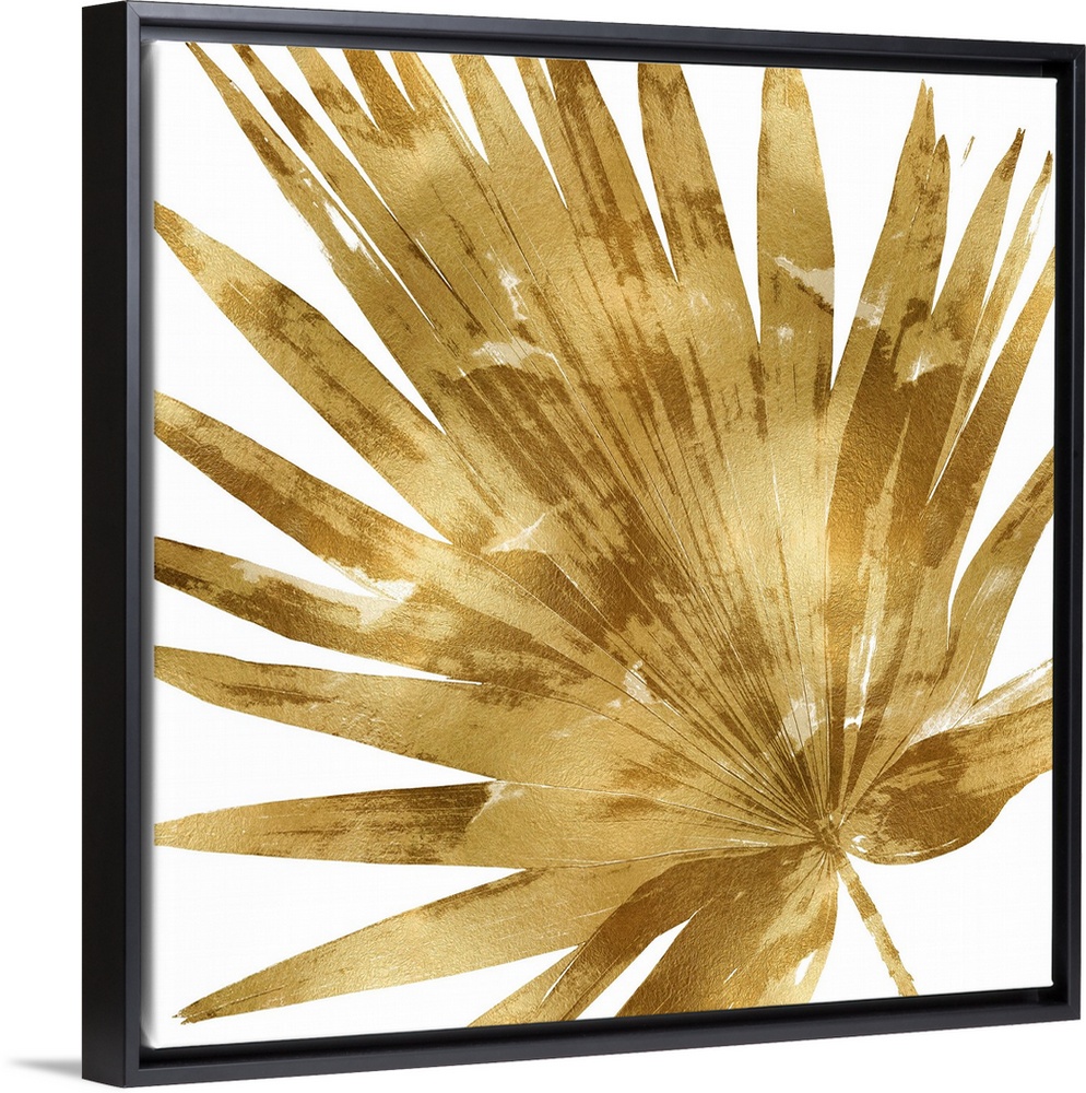 <p>Square decor with a metallic gold silhouette of a palm leaf on a solid white background.</p>