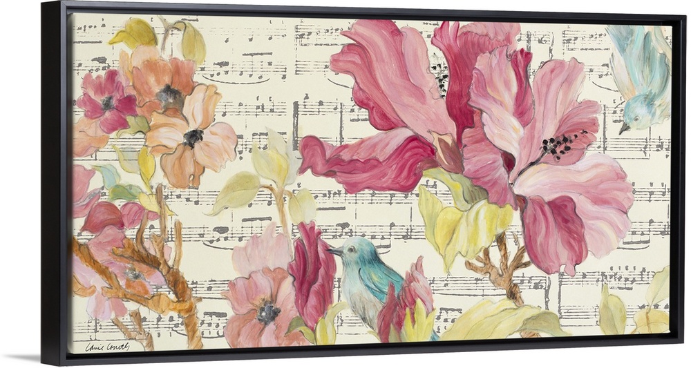 <p>Contemporary painting of beautiful blooming flowers in pink and orange with a small blue bird with a sheet music background.</p>