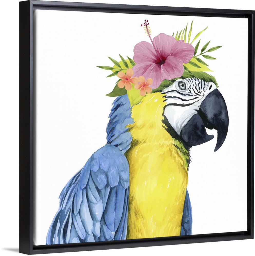 <p>This decorative artwork features an adorable parrot over a white background with a tropical flower crown on its head.</p>