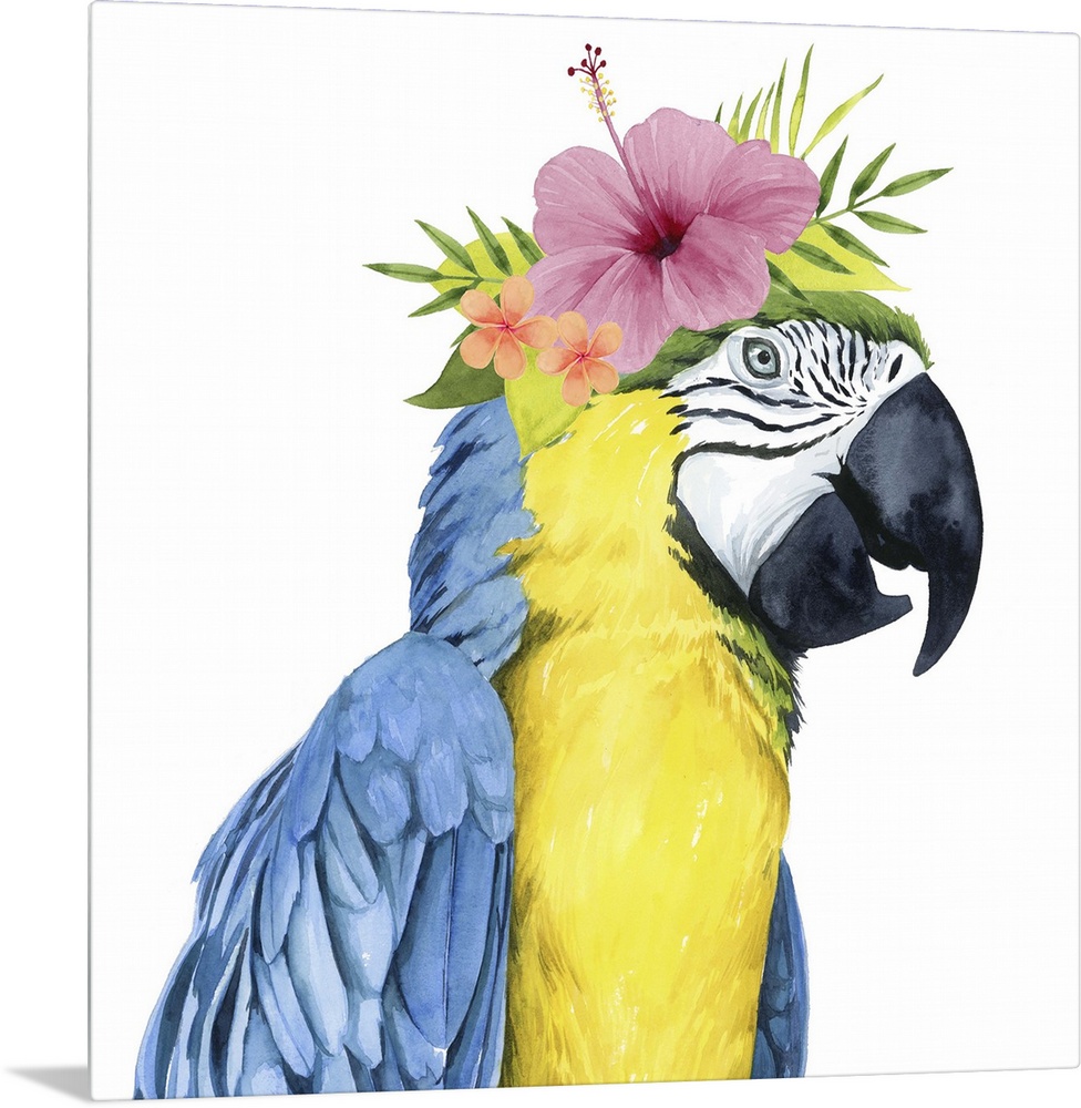 <p>This decorative artwork features an adorable parrot over a white background with a tropical flower crown on its head.</p>