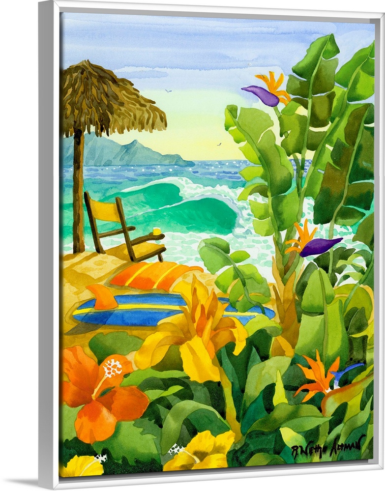<p>Tropical vegetation is painted in the foreground of this picture with a beach umbrella, chair, towel and surfboard laying on the beach just to the left of it.</p>