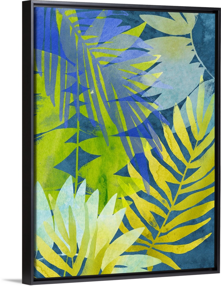 <p>Tropical palm leaf motif in blue, green, and yellow.</p>