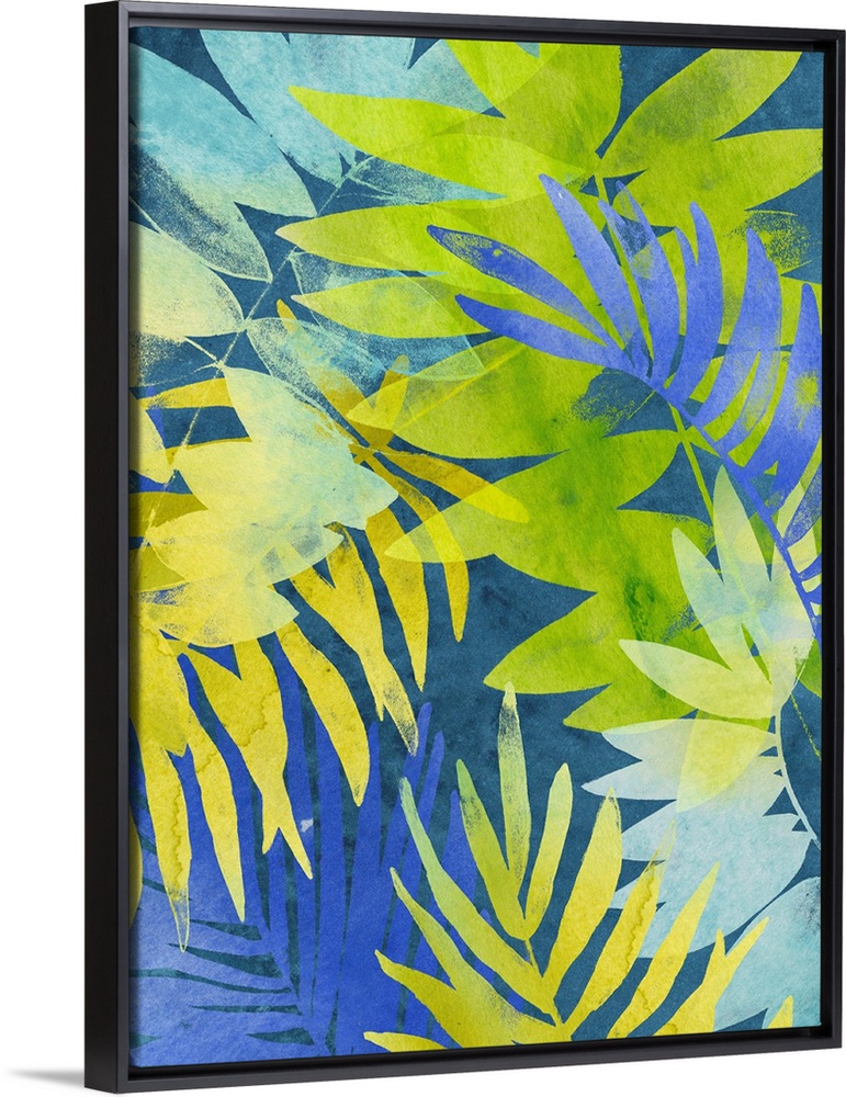 <p>Tropical palm leaf motif in blue, green, and yellow.</p>
