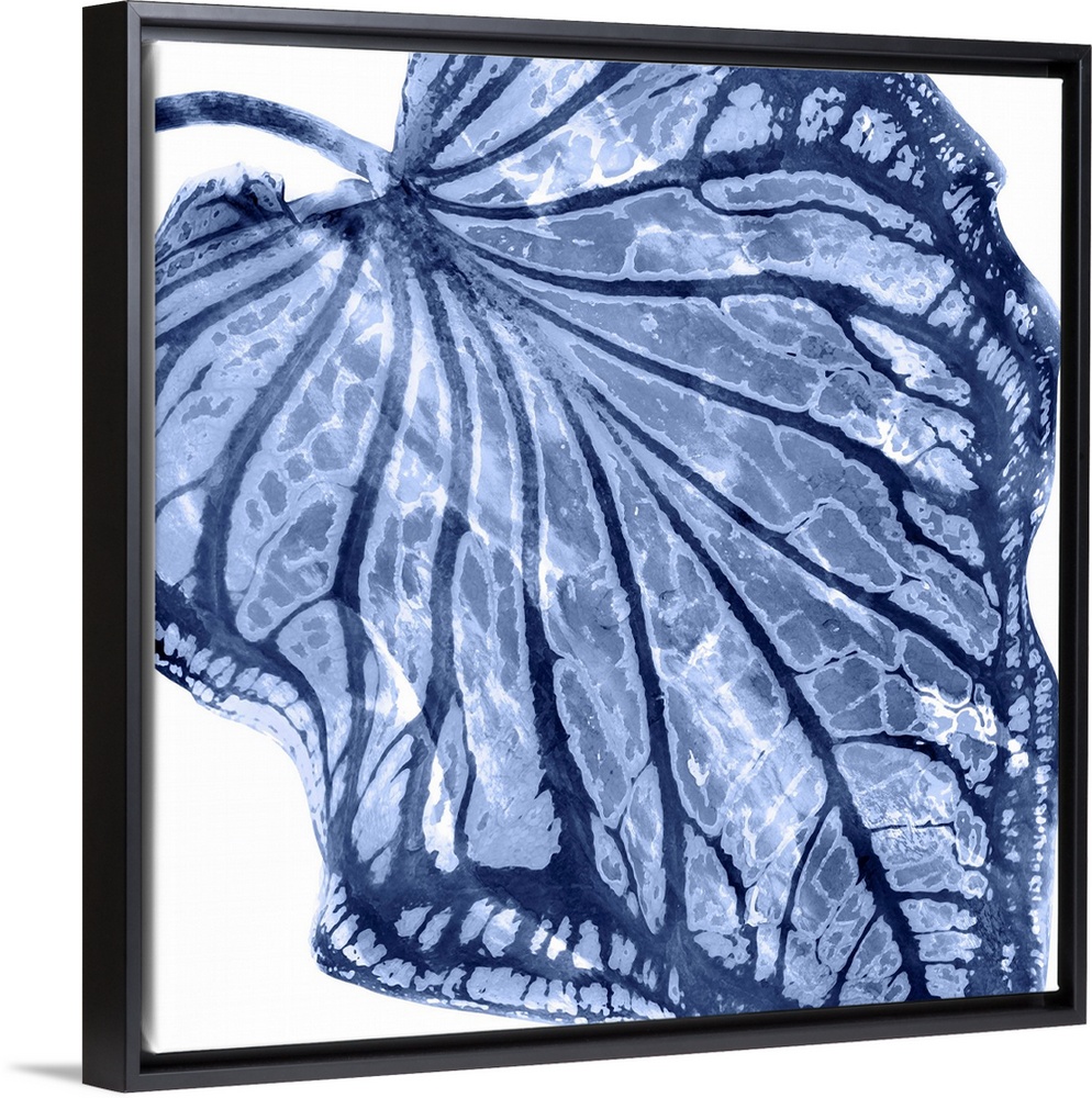 <p>Square decor with an indigo silhouette of a palm leaf on a solid white background.</p>