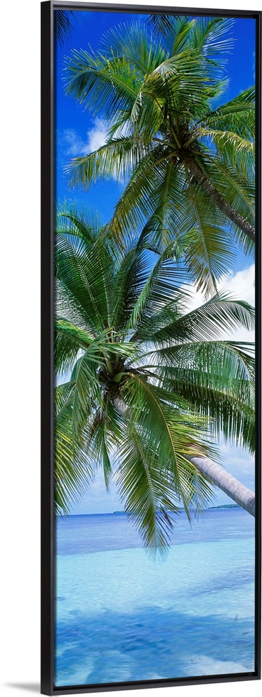 <p>This vertical, panoramic photograph shows a close up of palm fronds over clear ocean waters.</p>