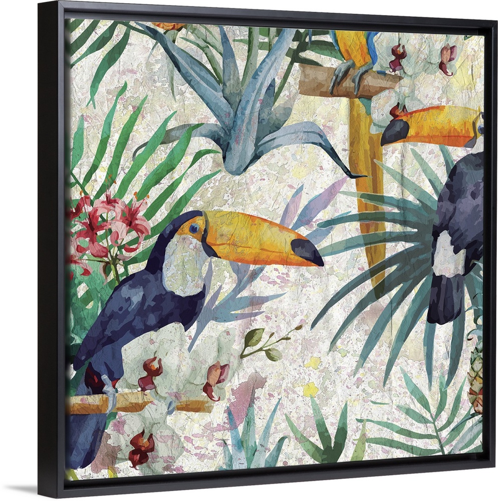<p>Tropical pattern with Toco Toucans on green palm leaves with white orchids.</p>