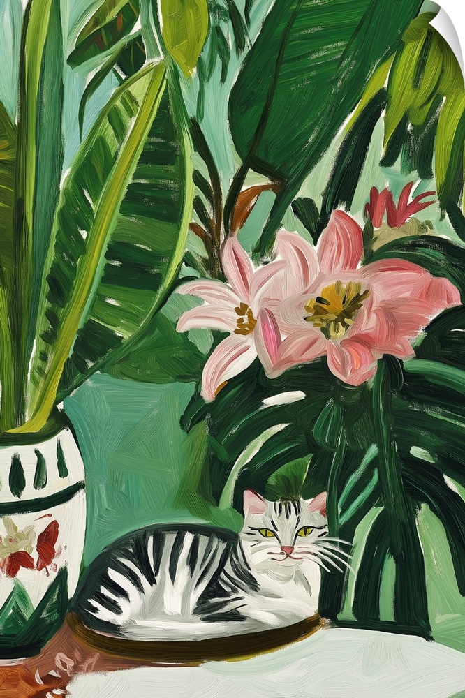 Art Mowzu Art Contemporary Art Emerald Florals Green Wall Art Painting Wildlife Cat
