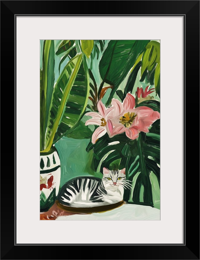 Art Mowzu Art Contemporary Art Emerald Florals Green Wall Art Painting Wildlife Cat