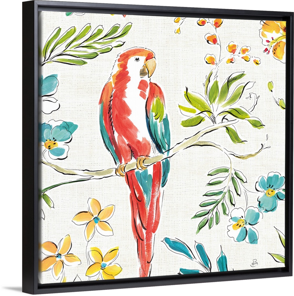 <p>Square image of a parrot on a branch surrounded by topical plants.</p>