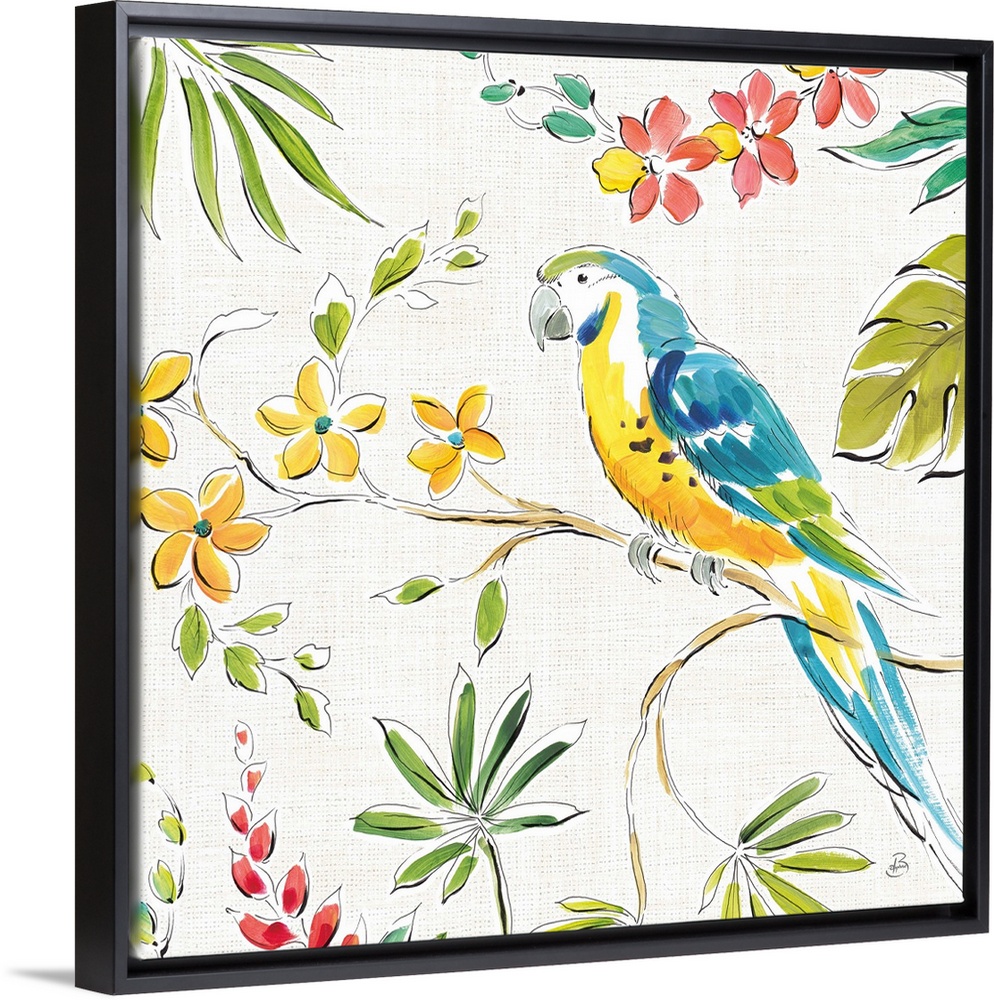 <p>Square image of a parrot on a branch surrounded by topical plants.</p>