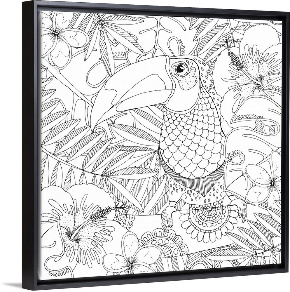 <p>Black and white lined design of a tropical Toucan perched on a branch surrounded by topical flowers and leaves.</p>