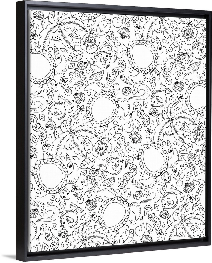 <p>Tropical themed black and white lined design consisting of turtles, seashells, fish, and other ocean items.</p>