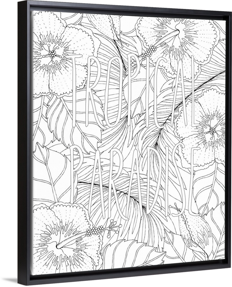 <p>Black and white line art of tropical flowers and plants with the phrase "Tropical Paradise" written on top in bubble letters.</p>