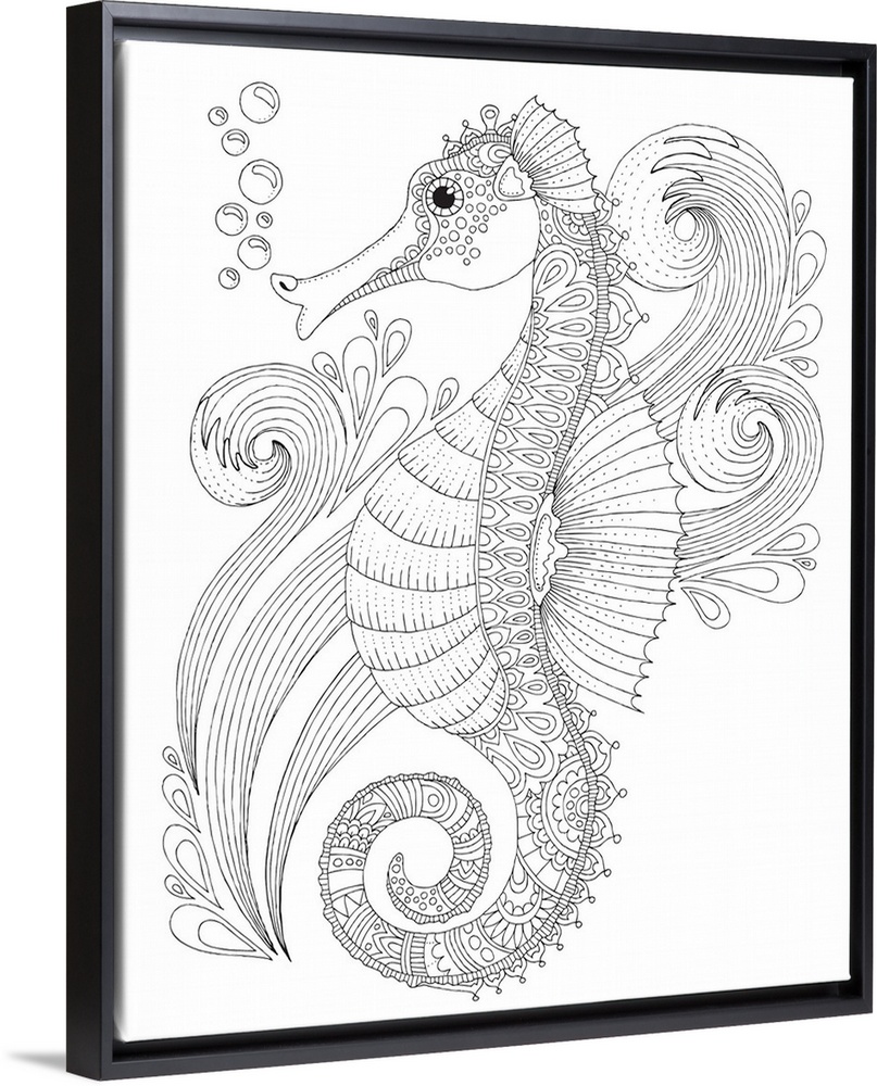 <p>Black and white lined design of a seahorse.</p>