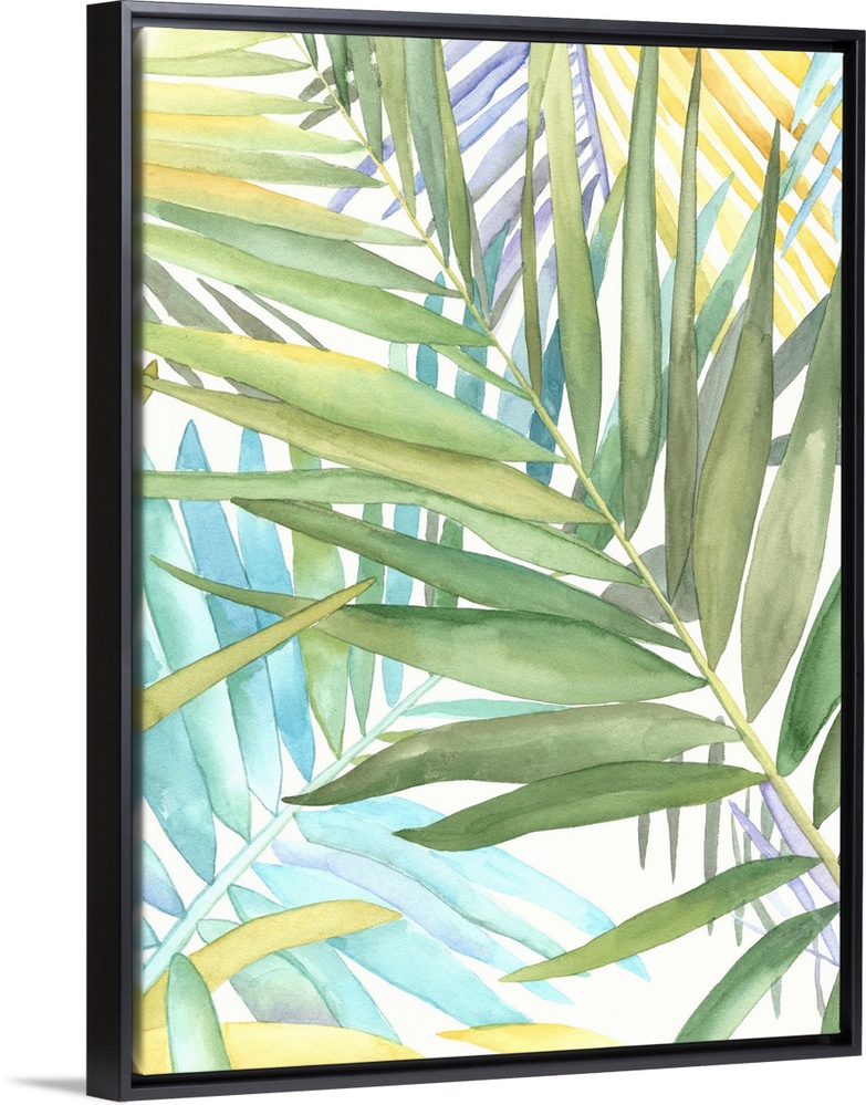 <p>Watercolor painting of several tropical leaves.</p>