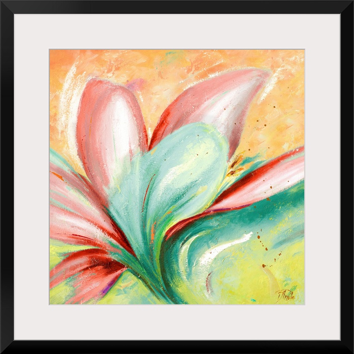 <p>Contemporary painting of a vibrant red flower against a bright green and orange background.</p>