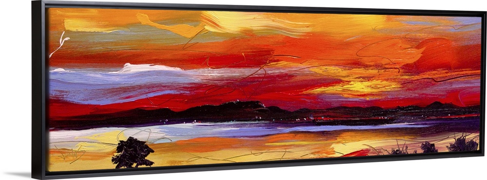 <p>Contemporary painting of a landscape under a vibrant warm sunset.</p>