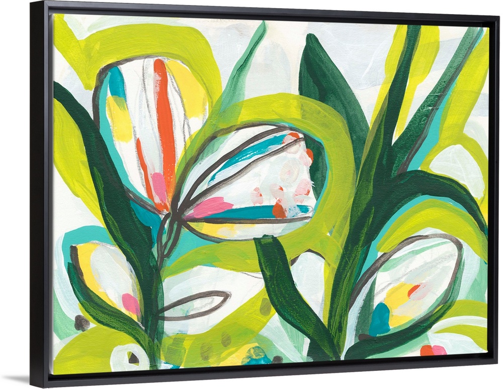 <p>Contemporary abstract painting with tropical floral shapes in vibrant green hues.</p>